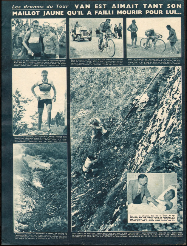 Comunque non si arrende e si butta coraggiosamente nella pericolosa discesa dell’Aubisque. Cade una prima volta. Riparte e prende la ruota di Fiorenzo Magni, uno dei migliori discesisti di tutti tempi, ma la discesa non è il suo forte e cade una seconda volta. Non demorde e riparte ma sbaglia, forse anche per una foratura, l’approccio ad una curva, sbanda e finisce fuori strada, in un burrone. Win fa un volo pauroso, 40 forse 70 metri nel vuoto. I soccorritori, il belga Decoc, che ha visto tutto, alcuni compagni di squadra, l’ammiraglia della squadra olandese e altri, lo vedono in una specie di “terrazzino” naturale: due metri oltre e sarebbe scomparso in un strapiombo alto 200 metri. Si rialza con le proprie gambe. Qualcuno improvvisa una corda allacciando i tubolari e si cala nel pendio, a rischio della propria vita, per salvare il corridore olandese. La foto immortala questi momenti di tensione. Quasi miracolosamente Van Est è fatto risalire sulla strada. Malconcio ma senza nulla di rotto, Van Est è scioccato ma vorrebbe ripartire. Il Commissario tecnico degli olandesi Pellenaars, lo convince a ritirarsi e lo accompagna all’ospedale dove gli verranno trovate alcune escoriazioni ma niente di più. Un miracolo. Verrà dimesso la mattina del 18 luglio. La squadra olandese si ritirerà con lui dal Tour.