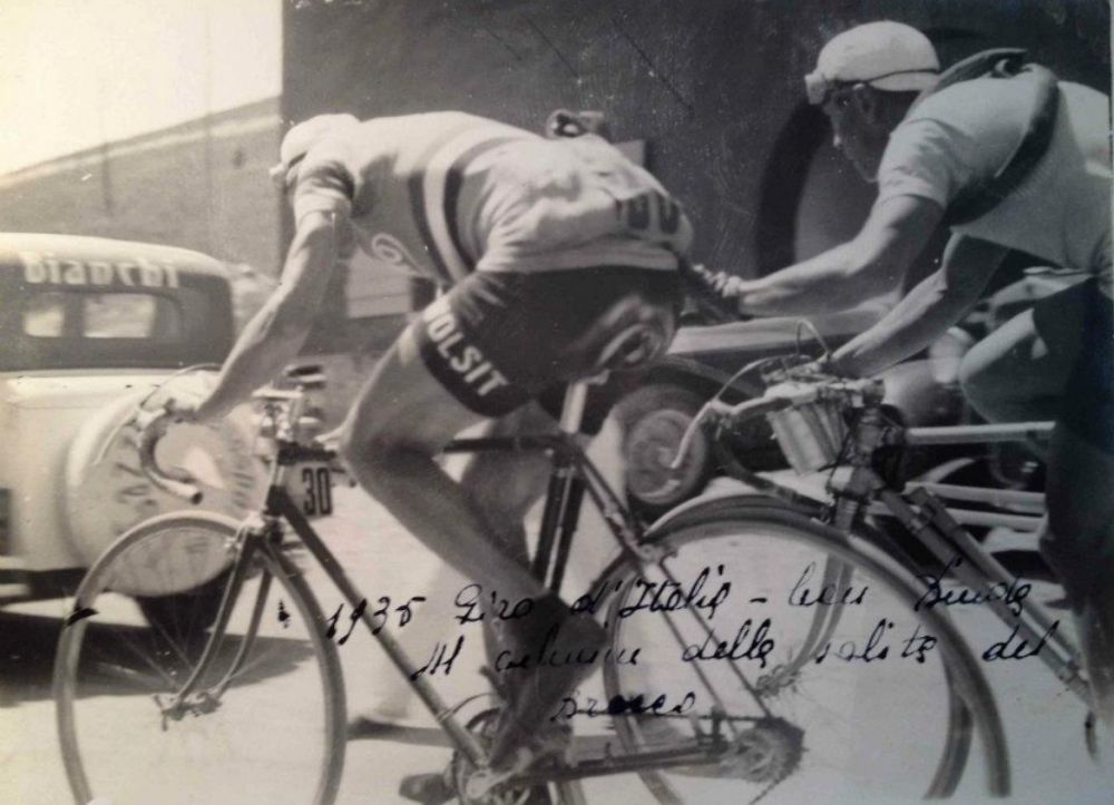Giro 1935 LA SPINTA A BINDAQuesta è una foto storica perché ritrae Alfredo Binda, in evidente difficoltà, ricevere una spinta da una mano amica.